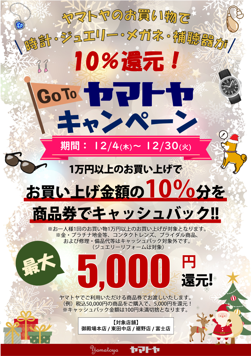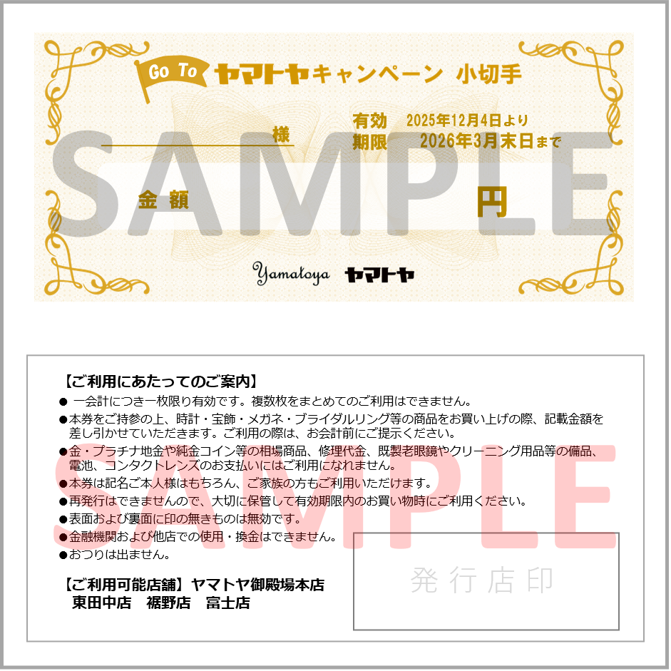 ※金・プラチナ地金等、コンタクトレンズ、ブライダル商品、および修理・備品代は商品券キャッシュバック対象外です。