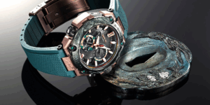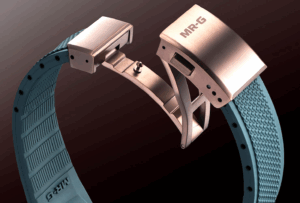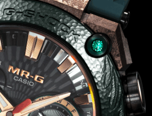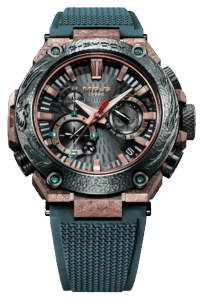ケースの独特の文様は、刃文に見られる沸(にえ)をイメージ。純チタンを再結晶化処理することで、刀の焼き入れによって生まれる沸の煌めく美しさを表現しています。加えて、日本刀の拵えの様々なパーツの主な材料である銅の色合いをブラウンAIPで表現しました。鉄と火が織りなす武具の強さ、美しさを、MR-Gならではのこだわりで体現しています。