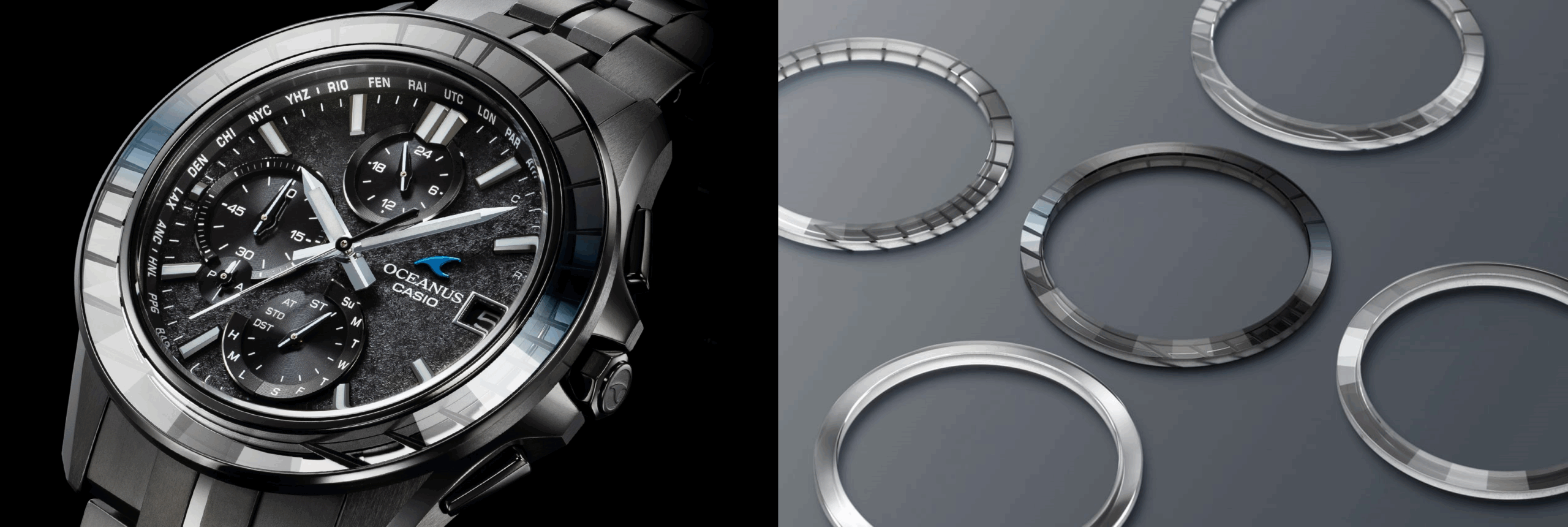デザインテーマは、「CALM NIGHT」。月の光に照らされた静かな海を、オールブラックのチタン外装と江戸切子のサファイアガラスベゼルで表現しました。千筋とよばれる伝統文様を刻んだベゼルは、江戸切子職人・堀口徹氏自ら意匠を監修。匠の技を駆使した繊細かつ精密なカッティングで、夜空に輝く月明かりとその明かりが彩る海を描きました。透明感のなかに深みと輝きを生み出す色調は、ブラックとシルバーのグラデーション蒸着によるもの。どこまでも続くような広大な海を表現し、見る角度によってブルーに偏光することで、オシアナスらしい表情を醸し出します。