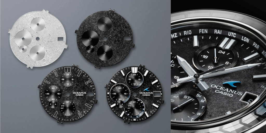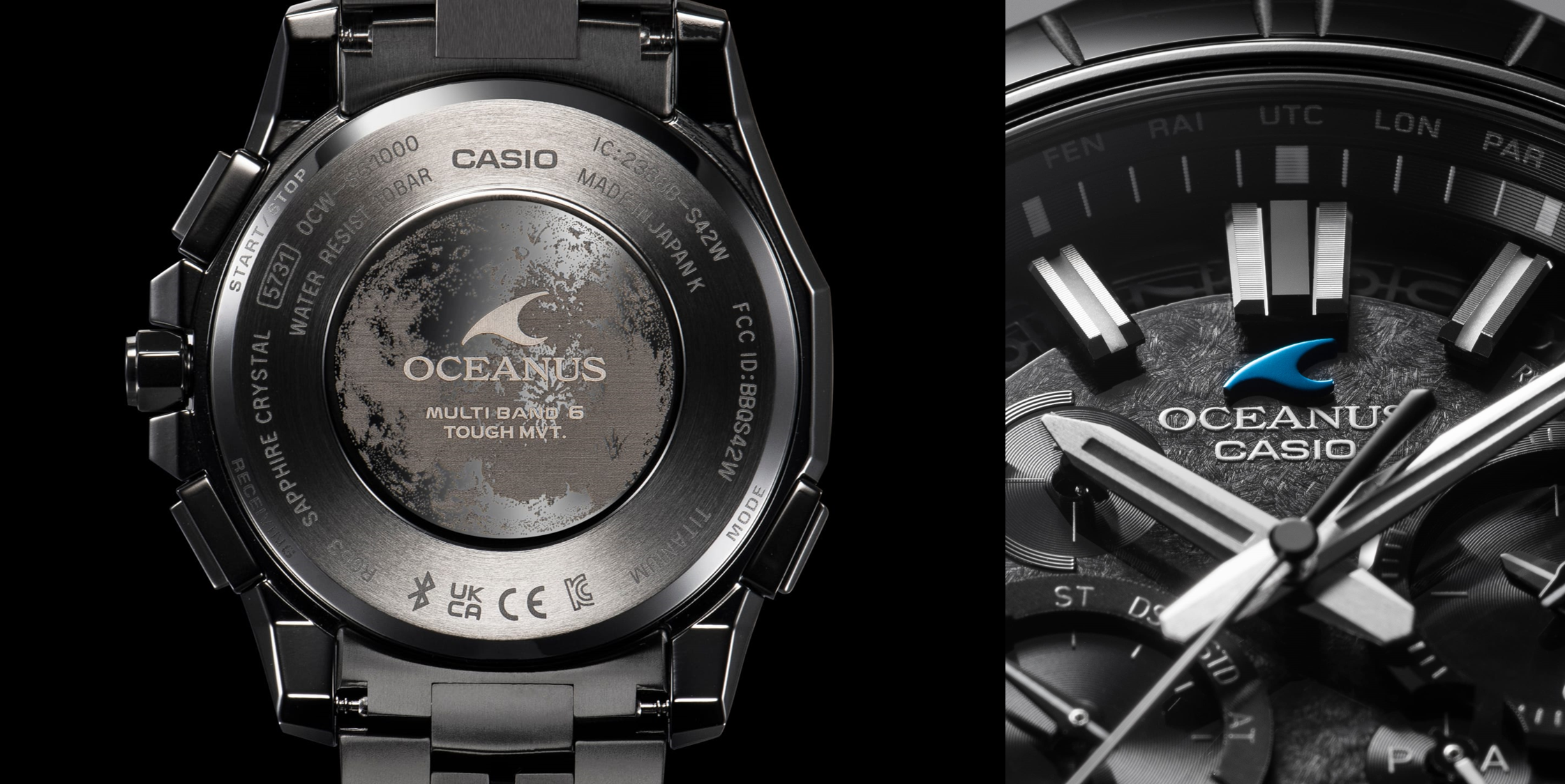 さらに、裏蓋のエンブレムにも月のモチーフを採用。DLCコーティングとレーザー処理で陰影に差を出し、月面を背景にオシアナスのロゴが浮き立つ特別仕様のデザインに仕上げています。