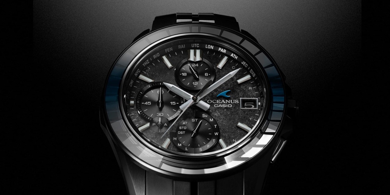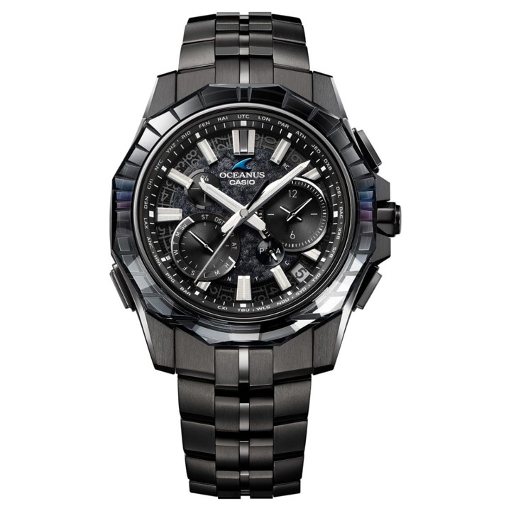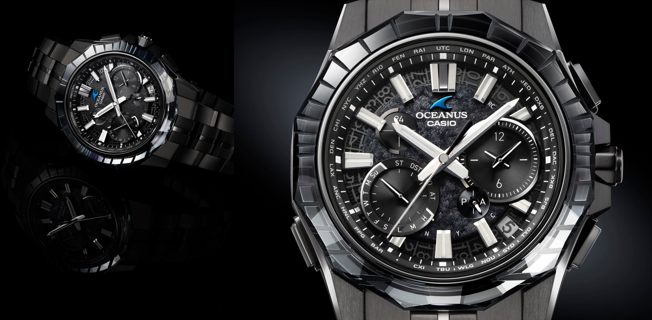 上質な仕上げと薄く美しいフォルムを追求している「OCEANUS Manta(オシアナス マンタ)」ライン。OCW-S7000CNは、その洗練された大人のエレガンススタイルを、「CALM NIGHT」というコンセプトで体現。月の光に照らされた夜の静かな海を、オールブラックのチタン外装と江戸切子のサファイアガラスベゼルで表現した限定モデルです。